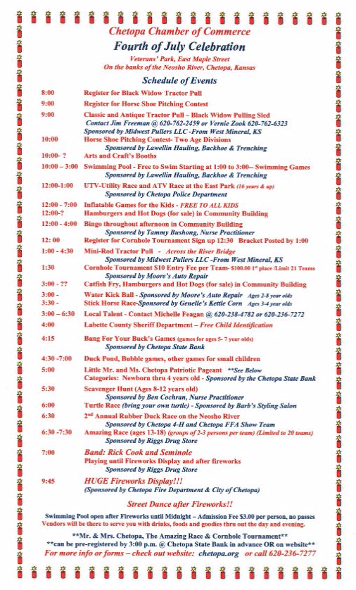 You can fill this out prior to the 4th of July and drop it off at Chetopa State Bank or bring with you on race day