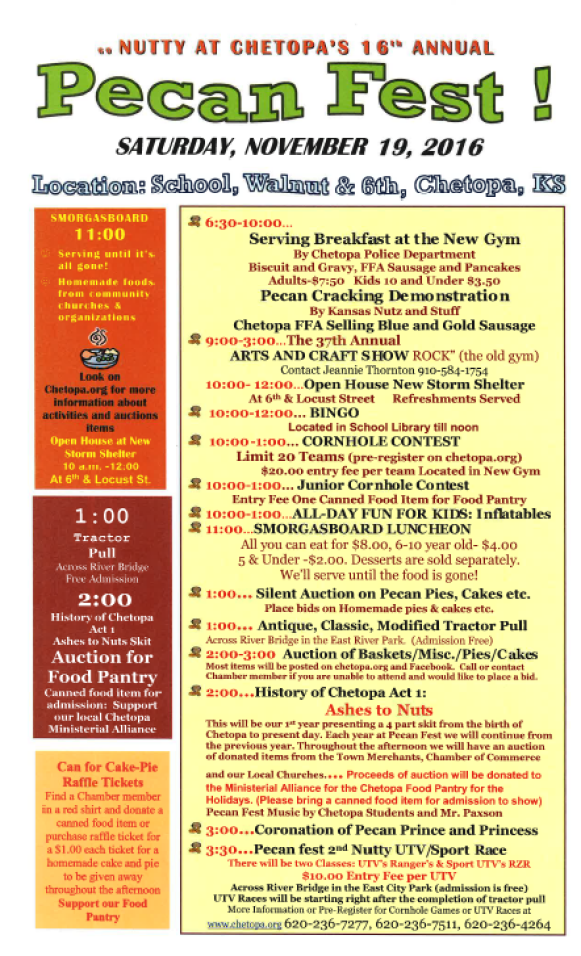 Pecan Fest is a fun filled event that is held every November to coincide with Pecan Harvest. Filled with all things nutty, it's a great outting for the entire family!! We start the day out with a hearty breakfast and then move on to a craft show and lots of other activities! Chetopa Chamber of Commerce is always looking for new ways to make this a huge success, so there is something for everyone at Chetopa's Pecan Fest.
